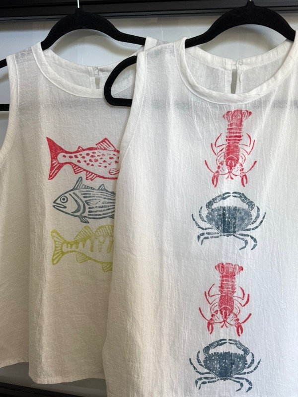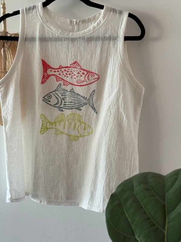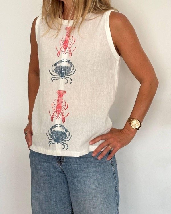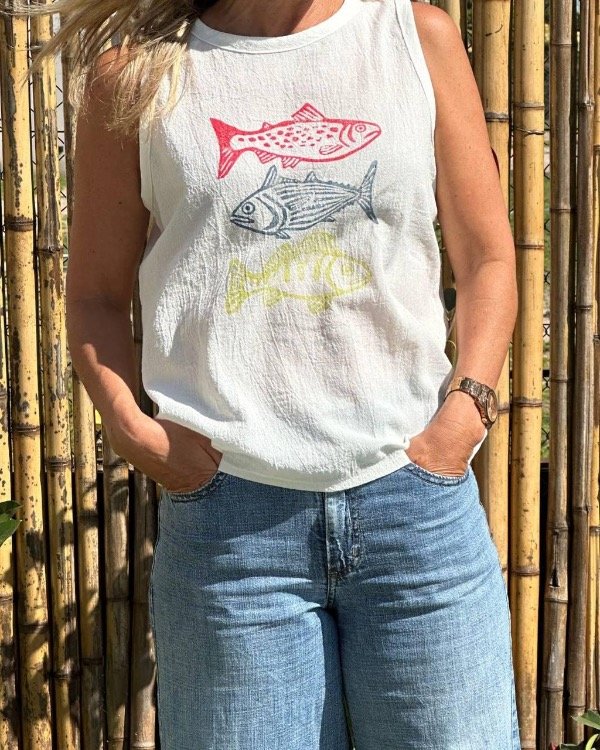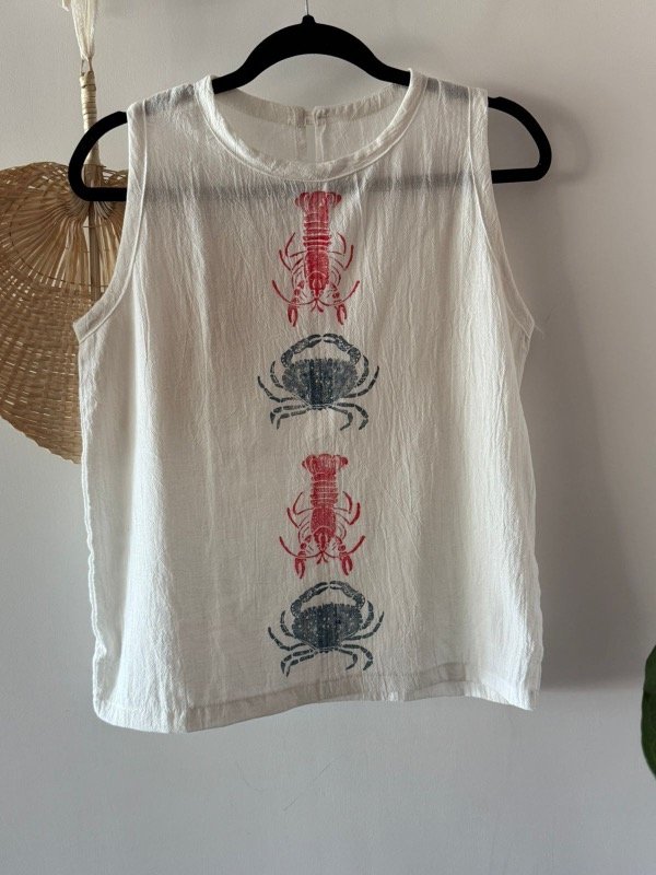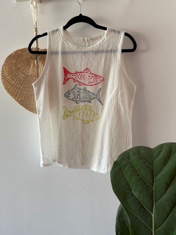 Remera en gasa de algodón teñido off white, musculosa y cuello redondo. estampada con sellos