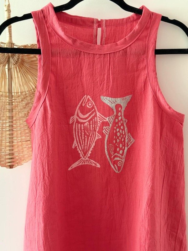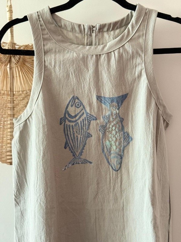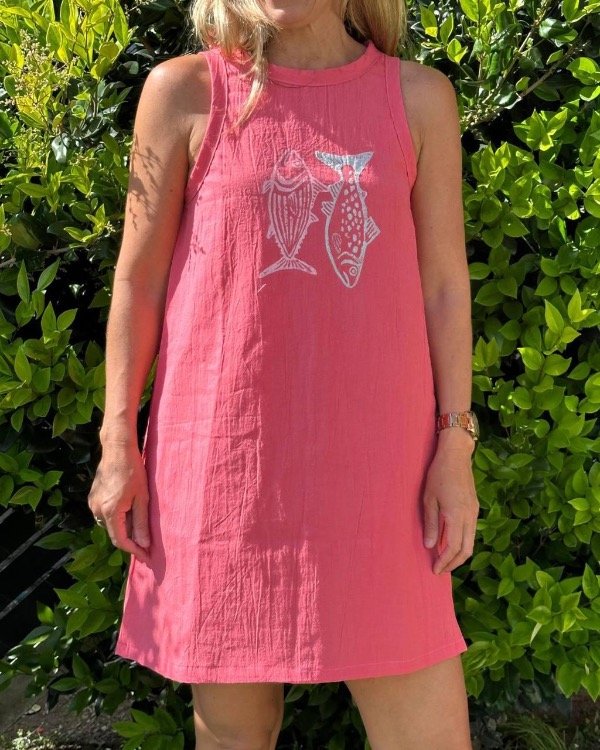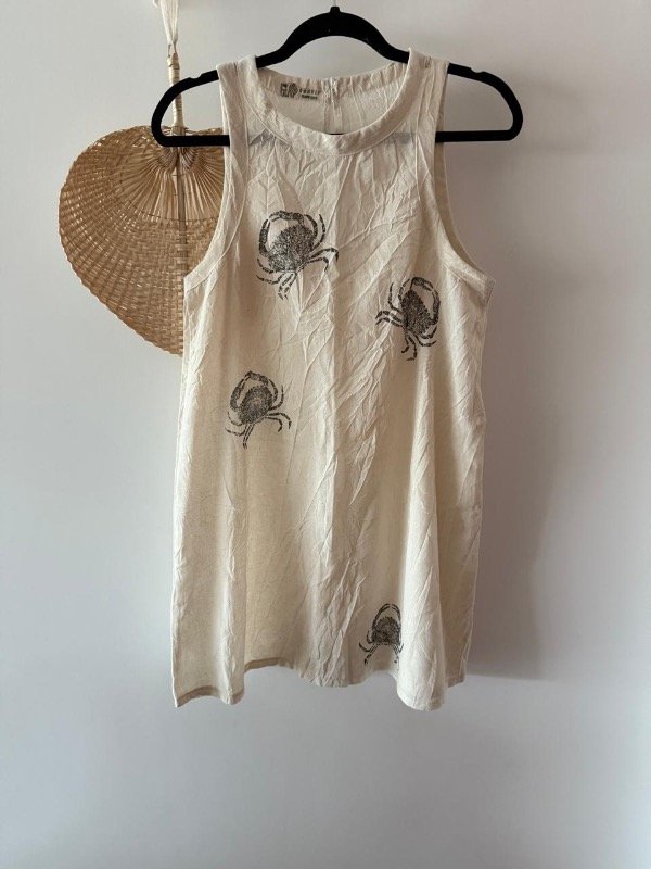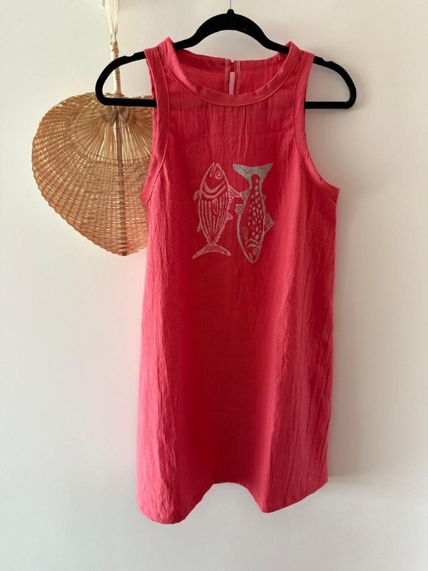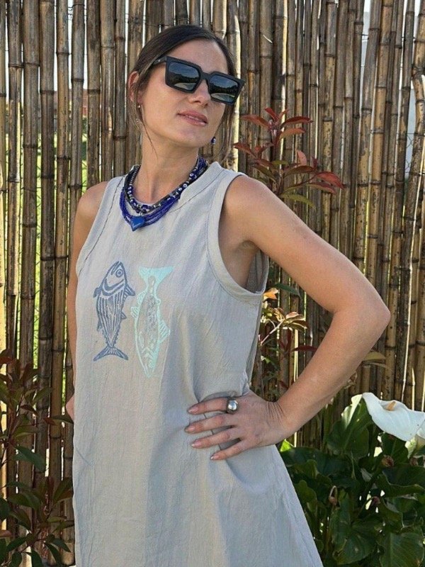 Vestido Playero de Tusor Teñido con estampas en pecho.