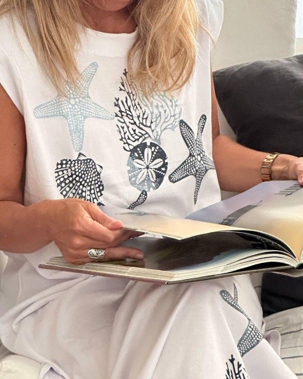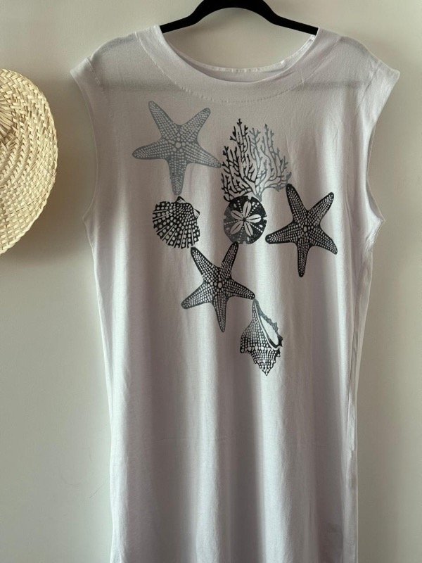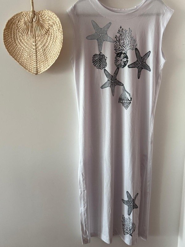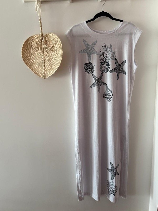 Vestido Mar confeccionado en algodón, con estampas realizadas con sellos.