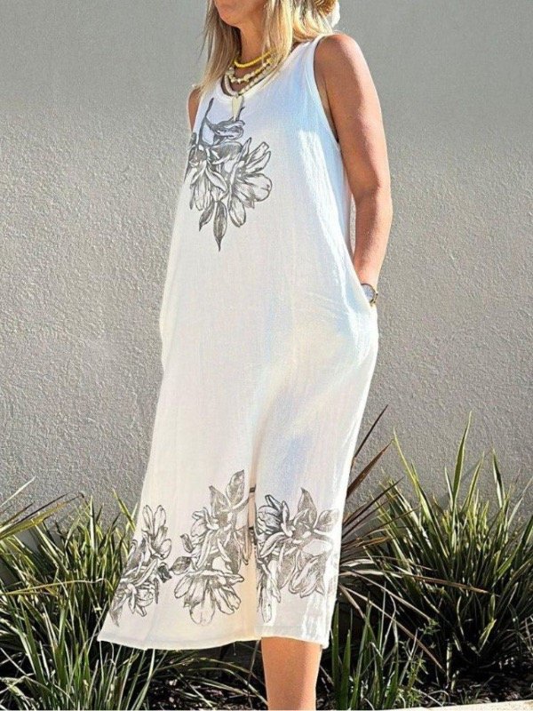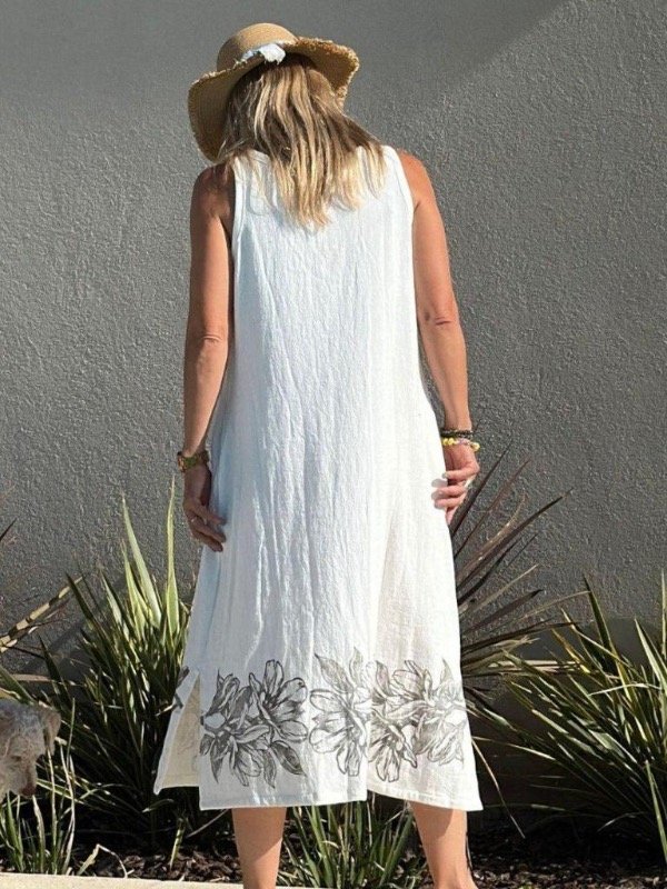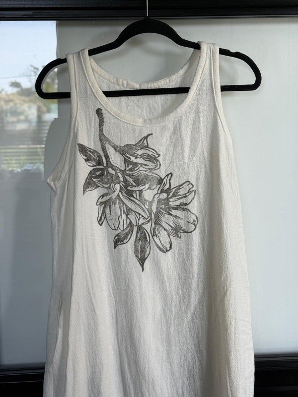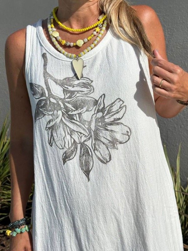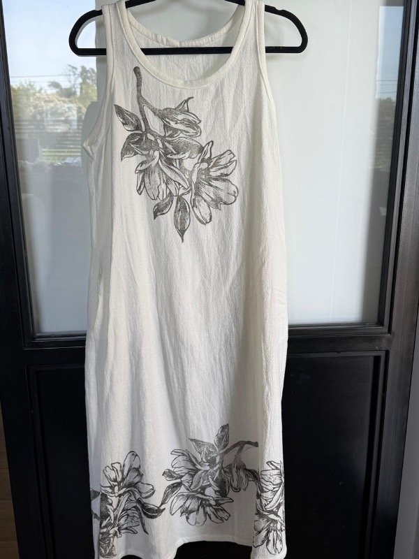 Vestido en gasa doble trama off white con estampas en sellos de flor.